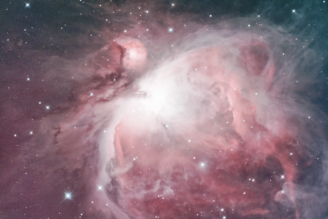 超有名な散光星雲・オリオン大星雲です。実はレデューサーで広範囲をモザイク撮影する予定でしたが、事もあろうにレデューサーを忘れてしまい、仕方なく超ベーシックな撮り方にしました。 |